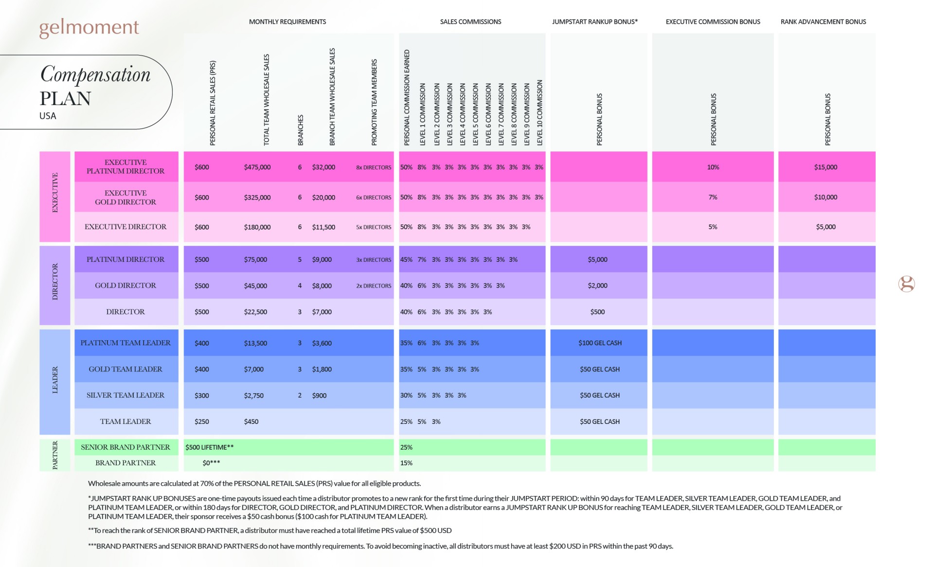 During your first 90 days as a distributor, you can earn up to $250 in gel cash (free products of your choice!) by reaching the ranks of Team Leader through Platinum Team Leader. You will also receive a cash bonus when your personally sponsored recruits earn this bonus for themselves too! Furthermore, during your first 180 days as a distributor, you can earn up to $7,500 in cash bonuses by reaching the ranks of Director through Platinum Director!